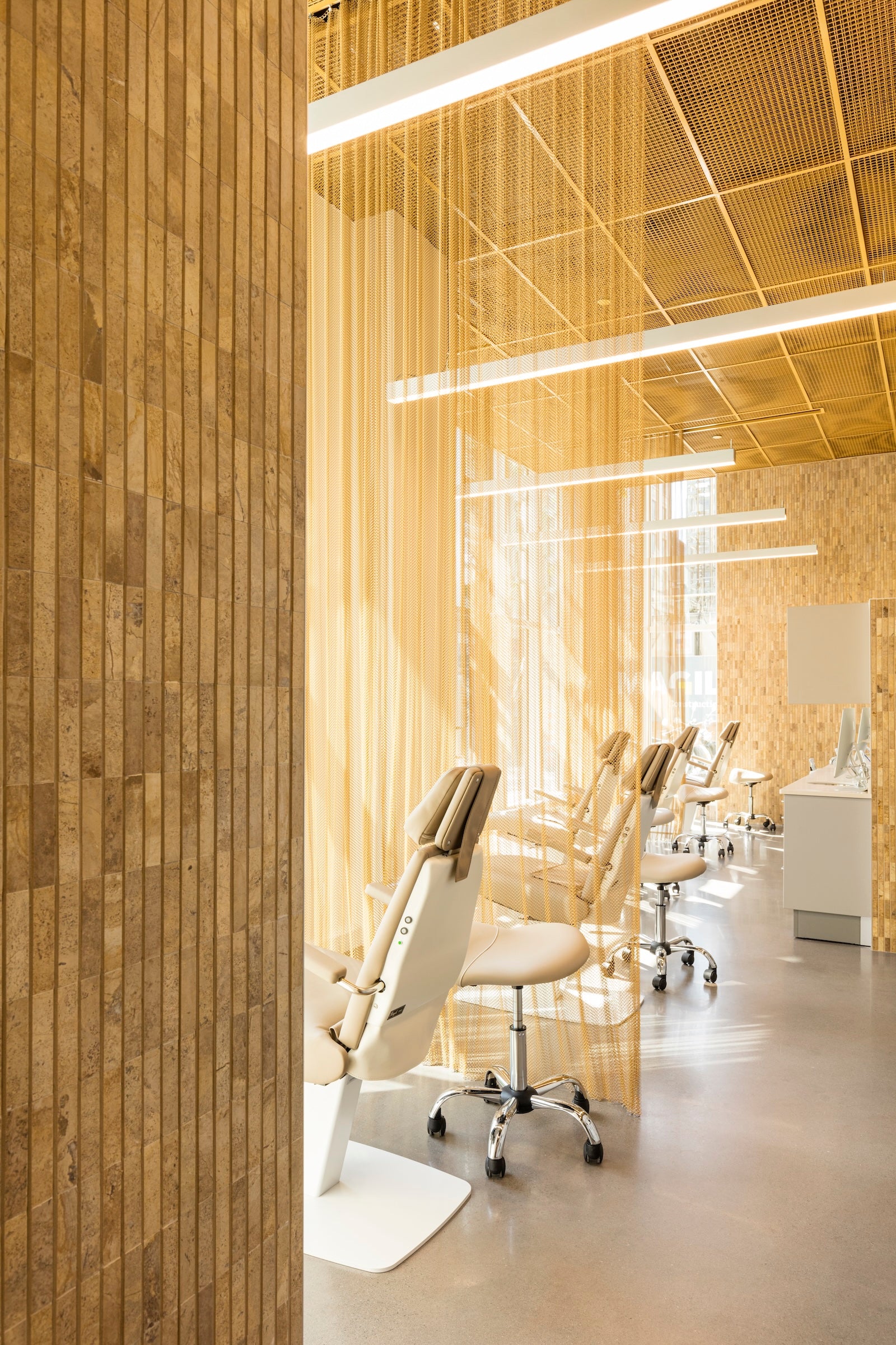 Color was used in order to create a neutral and immersive palette. The array of complementary shades allows for a warm and calming environment for patients and staff. All color choices were made to serve the harmony of the space, as well as add depth and complexity. By bringing in noble materials, a timeless space is created. The multitude of surfaces covered in individually hand laid marble mosaic tiles epitomizes the calming effect created by subtle color variation over large surfaces of repeated pattern. Accents of gold are continuously found in areas such as the retractable curtains in the open clinic as well as door frames, wall partitions and faucets. The multileveled custom gold mesh ceiling emphasizes height and lets the environment breathe upward with a light-catching quality. The bright gold of waiting room platform, reflecting in the basin beneath creates color in motion.